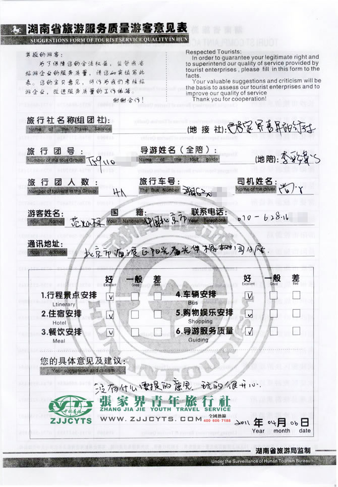 北京海淀區(qū)“范先生”與張家界青旅旅游顧問——曹娟在3月22日取得聯(lián)系,經(jīng)過3次的商談,雙方達(dá)成協(xié)議并簽訂了《國內(nèi)旅游組團(tuán)標(biāo)準(zhǔn)合同》,范先生一行4人于4月2日下午抵達(dá)長沙,之后便開始為期4天行程的走進(jìn)湖南,走進(jìn)湘西之旅。 此次行程是由我們優(yōu)秀導(dǎo)游——李彩萍,負(fù)責(zé)旅游接待工作,李導(dǎo)在旅游過程中講解詳細(xì),服務(wù)周到,客人玩的很開心、很滿意。