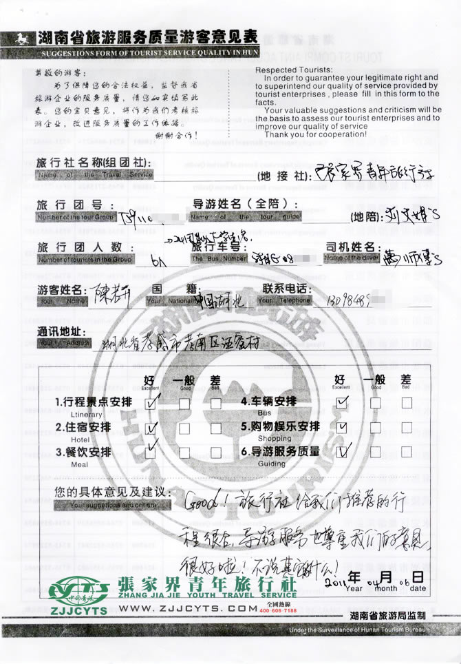 湖北孝感市“陳先生”與張家界青旅旅游顧問——“李芳瓊”在3月20日取得聯(lián)系,經(jīng)過3次的在線商談后,雙方達(dá)成協(xié)議并簽訂了《國內(nèi)旅游組團(tuán)標(biāo)準(zhǔn)合同》,陳先生6人一行于4月2日晚抵達(dá)張家界,之后便開始為期4天行程的玩轉(zhuǎn)湘西之旅。 此次行程是由我們優(yōu)秀導(dǎo)游——?jiǎng)⑽木辏?fù)責(zé)旅游接待工作,劉導(dǎo)在旅游過程中講解詳細(xì),服務(wù)周到,客人也很滿意。并給予導(dǎo)游服務(wù)較高的評(píng)價(jià)!