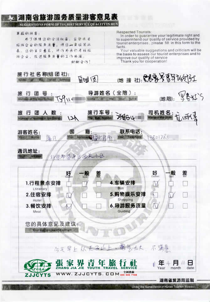 北京北京市“廖女士”與張家界青旅旅游顧問(wèn)——“李 霞”在3月20日取得聯(lián)系,經(jīng)過(guò)兩次在線溝通和1次電話商議,最終確立由我社負(fù)責(zé)旅游接待安排,并與之簽訂了地接協(xié)議;廖女士12人貴賓一行(客人自組團(tuán))于4月8日抵達(dá)張家界市,次日便開(kāi)始了為期3天行程暢游張家界之旅。 此次行程是由我社優(yōu)秀導(dǎo)游——羅春紅,負(fù)責(zé)旅游接待工作,羅導(dǎo)在旅游過(guò)程中講解詳細(xì),服務(wù)周到,客人對(duì)其很滿意,但在4月10日上午游覽天子山時(shí),霧氣太大,未能全覽景區(qū),給予了不滿意的評(píng)價(jià)!