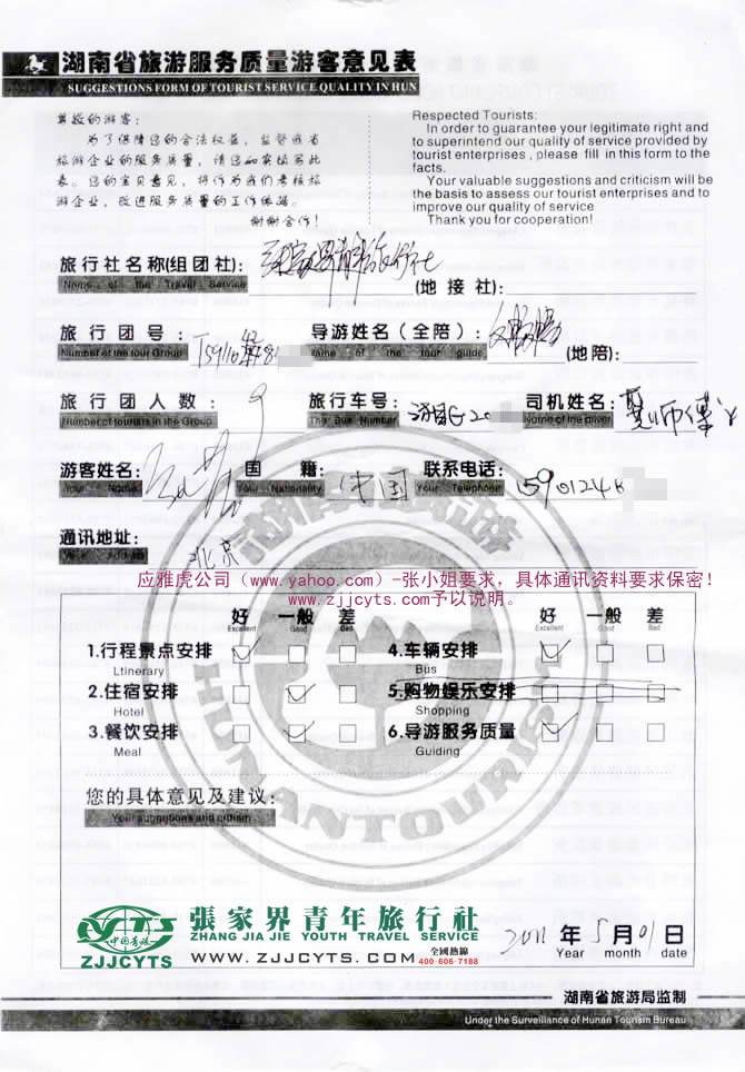 | 在此鳴謝“北京雅虎總公司”張小姐、四川家人張 叔、王阿姨、廖先生、姜先生等9人貴賓,給予張家界青旅為之服務(wù)的機會,同時也自內(nèi)心感謝貴賓們對張家界青旅的信任和支持,也感謝各位為我們的服務(wù)工作給予評價;您的寶貴意見給予我們的是成長發(fā)展的動力,因為有你們的關(guān)注,我們才能走的更遠,因為有你們的信任,我們的成長才會更加精彩。