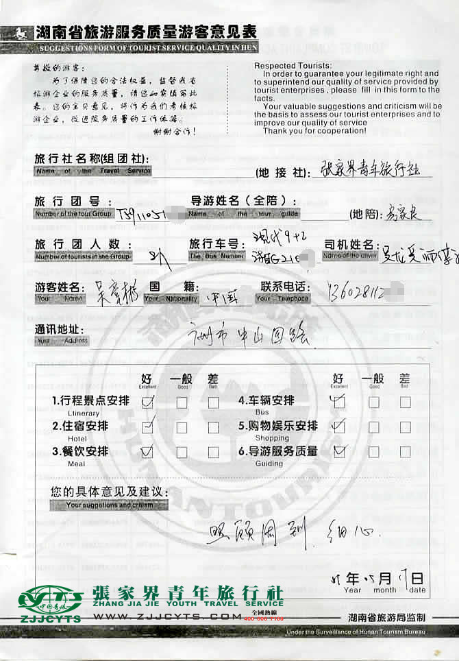 廣東廣州市“吳先生”與張家界青旅旅游顧問——客服“谷盈”在5月03日取得聯(lián)系,并與吳先生、廖小姐一行8人(其中有滿60歲老人一名;1.2米幼童一名),就同行人員基本情況,做了深層次的在線溝通,并最后在5月09日確立《國內(nèi)旅游組團接待合同》,由我社負責接待安排,并與之簽訂了接待服務(wù)協(xié)議;吳先生8人一行(含全陪1人)于5月13日上午09:15點許抵達張家界市,之后便開始了3天行程的走進的美麗張家界之旅。 5月17日下午結(jié)束行程后火車返程