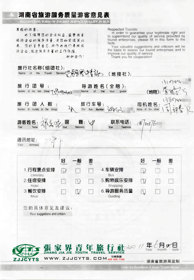 在此感謝上海閔行區(qū)張先生一行三位,給予張家界中青旅為您一行服務(wù)的機(jī)會(huì),同時(shí)也感謝貴賓一行對我社行程安排及導(dǎo)游服務(wù)給予的高度評(píng)價(jià),和對服務(wù)過程中給予的配合與支持,歡迎您和家人有空再次蒞臨美麗的湘西做客觀光。--客服“黃 靜”留言。