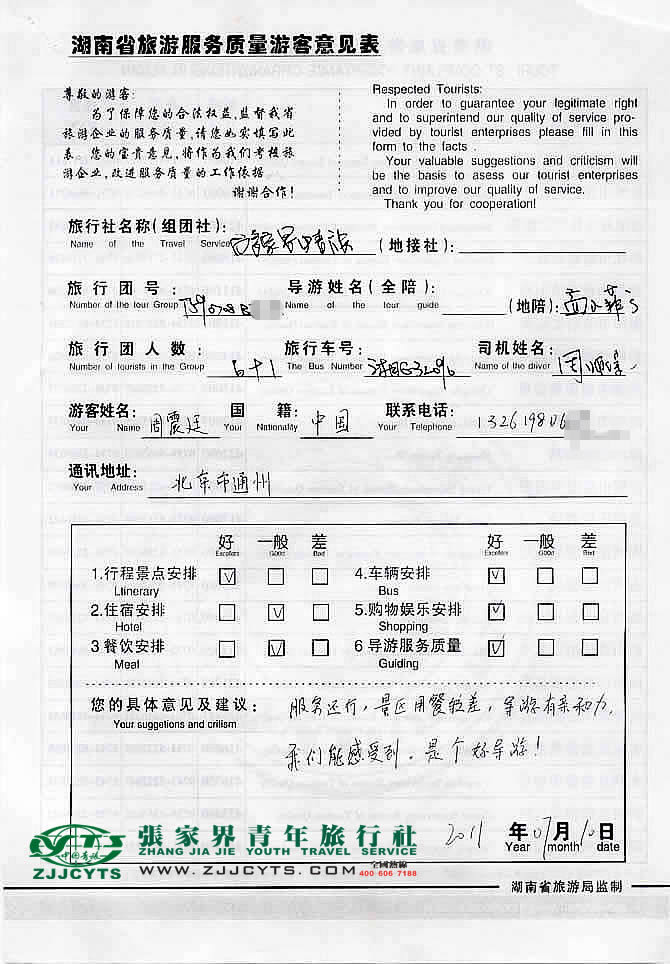北京通州區(qū)“周先生”與張家界青旅旅游顧問——客服“王國華”在6月09日得聯(lián)系,并就行程的合理選擇、旅游過程的具體要求、服務范圍,做了多次在線溝通和電話溝通,經(jīng)過細致的商磋,最終在06月23日確立《國內旅游組團接待合同》,并正式確立由我社負責全程接待安排;周總一行7人(其中含有1.2以上學齡學生1名),于07月07日中午乘坐K267次空調特快,于次日7月08日上午11:15許抵達張家界,我社業(yè)務部經(jīng)理張經(jīng)理、導游和司機前往迎接站,當日便開始了為期3天行程的走進魅力湘西之旅。 07月10日下午從鳳凰返程張家界;搭乘K968/K965次返程。