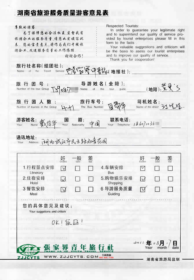 08月15日戴小姐一行5人(其中有一滿70歲老人,一個小孩)乘坐火車于12:00許抵達(dá)張家界,我社導(dǎo)游和司機迎接站,當(dāng)日便開始了為期3天行程的走進張家界之旅;于08月17日下午17:00多送團,貴賓搭乘張家界-武漢K968次18:00許返程回家。