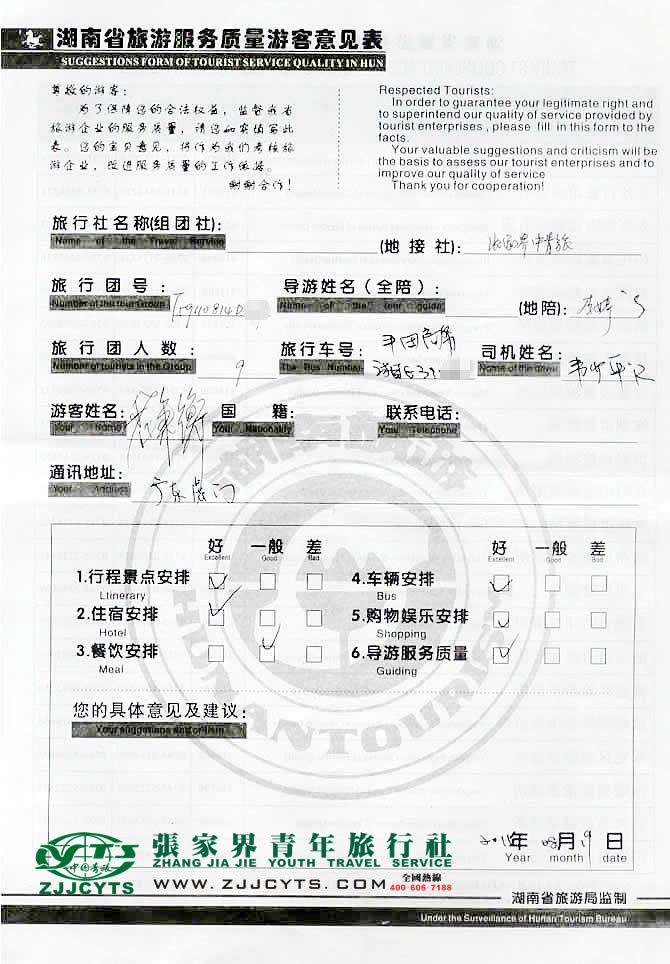 | 在此向廣東東莞虎門白先生一行9位貴賓表示感謝,給予我們中青旅為您一行服務(wù)的機(jī)會(huì),同時(shí)也感謝貴賓一行對(duì)我社行程安排及導(dǎo)游服務(wù)給予的高度評(píng)價(jià),歡迎各位貴賓再次蒞臨美麗的張家界做客觀光,祝愿返程順利平安。--客服經(jīng)理“張德建”先生留言。 |