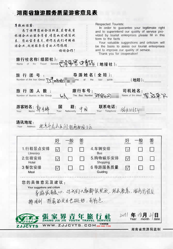 北京房山區(qū)“郭先生”與張家界青旅旅游顧問(wèn)——客服“王國(guó)華”在08月04日得聯(lián)系,并就線路、行程的合理選擇、旅游景點(diǎn)的分布,以及服務(wù)的具體要求、范圍,做了多次在線溝通和電話溝通,經(jīng)過(guò)細(xì)致的商磋,最終在08月11日雙方簽訂了《國(guó)內(nèi)旅游組團(tuán)接待合同》,并正式確立由我社負(fù)責(zé)全程接待安排;郭先生一行6人(1名滿60歲老人,1位滿70歲老人),于08月17日中午乘坐K267次空調(diào)特快,于次日8月18日商務(wù)11:00許抵達(dá)張家界火車站,我社導(dǎo)游和司機(jī)前往迎接站,當(dāng)日上午便開(kāi)始了為期4天行程的走進(jìn)魅力湘西之旅。 08月21日下午13點(diǎn)自鳳凰古城返程張家界,搭乘K968次返程。