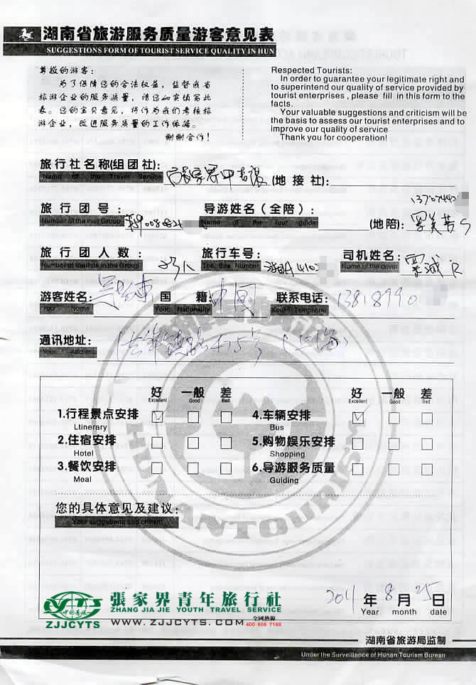 上海長寧區(qū)“吳先生”與張家界青旅旅游顧問——客服“卓東來”在08月14日取得聯(lián)系,并就線路、行程的合理選擇、旅游景點(diǎn)的選定,以及服務(wù)的具體要求、范圍,做了多次在線溝通和電話溝通,經(jīng)過細(xì)致的商磋,最終在08月17日雙方簽訂了《國內(nèi)旅游組團(tuán)接待合同》,并正式確立由我社負(fù)責(zé)全程接待安排;吳先生一行23人貴賓于08月22上午乘坐K533次,于次日8月23上午7:00許抵達(dá)張家界火車站,我社導(dǎo)游和司機(jī)前往迎接站,當(dāng)日便開始了為期3天行程的走進(jìn)張家界山水之旅,08月25日下午18點(diǎn)結(jié)束行程,搭乘K1374次返程赴上海。