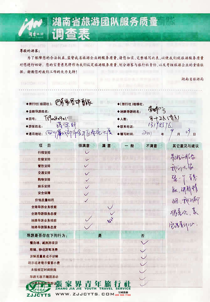 | 在此向四川成都成都市晨曦電力有限責任公司 蔣先生一行10位貴賓致以衷心的感謝,感謝您給予我們中青旅為您一行服務(wù)的機會,同時也感謝貴賓一行對我社行程安排及導游服務(wù)給予的高度評價,歡迎各位貴賓再次蒞臨美麗的張家界做客觀光,順祝商祺。--客服經(jīng)理“李朝陽”先生留言。 |