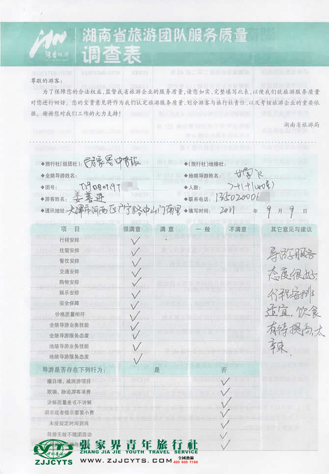 天津天津市“姜先生”與張家界青旅旅游顧問——客服“谷小盈”在08月27日取得聯系,并就線路、行程的合理選擇、旅游景點的選定,以及服務的具體要求、范圍與姜先生,做了多次在線溝通和電話溝通,最終在08月29日雙方簽訂了《國內旅游組團接待合同》,并正式確立由我社負責全程接待安排;姜先生一行9人,于09月05下午從天津搭乘海航HU7561次航班,于當日11:10許抵達長沙,當天我社安排長沙分公司導游和司機迎接站,在長沙短暫做停留之后,當日搭乘我社安排的商務車,抵達張家界,次日便開始了為期4天行程的魅力湘西之旅,該行程于09月09日下午17:00許在長沙結束,貴賓一行搭乘GS7562航班返程,