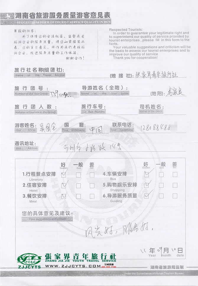 | 在此向湖南常德吳先生、廣東張先生一行5位貴賓,致以衷心的謝意,感謝您給予我們中青旅為您一行服務(wù)的機(jī)會(huì),歡迎各位貴賓再次蒞臨美麗的張家界做客觀光。--客服“王國(guó)華”留言。 |
