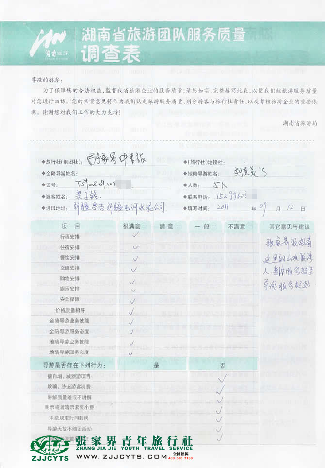 新疆昌吉市“梁先生”與張家界青旅旅游顧問——客服“李朝陽”在09月04日取得聯(lián)系,并就線路、行程的合理選擇、旅游景點的選定,以及服務(wù)的具體要求、范圍與梁先生,做了電話溝通,得悉梁先生一行來長沙參加專題會議,故我們推薦了比較合適的線路,也得到貴賓的認(rèn)同,最終在09月05日雙方簽訂了《國內(nèi)旅游組團(tuán)接待合同》,并正式確立由我社負(fù)責(zé)全程接待安排;梁先生一行5人,于09月08下午4點許,自長沙出發(fā)搭乘大巴車抵達(dá)張家界,約晚上23點許抵達(dá),住宿東航觀光酒店,于次日參加我社散客拼團(tuán)游,開始了為期4天行程的湘西之旅,該行程于09月12日下午17:00許在張家界結(jié)束,貴賓一行搭乘長途客車返程回長沙。在長沙中轉(zhuǎn)返程