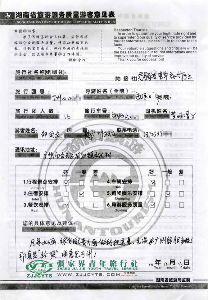 廣東廣州市“鄒先生”與張家界青旅旅游顧問——陳苑梅在2010年12月04日取得聯(lián)系,經(jīng)過2次的商談,雙方達(dá)成協(xié)議并簽訂了《國內(nèi)旅游組團(tuán)標(biāo)準(zhǔn)合同》,鄒先生16人一行于12月09日下午1點(diǎn)多抵達(dá)張家界,之后便開始了4天行程的探密湘西之旅。 此次行程是由我們優(yōu)秀導(dǎo)游——孟素素,負(fù)責(zé)旅游接待工作,孟導(dǎo)在旅游過程中講解詳細(xì),服務(wù)周到,客人比較滿意。