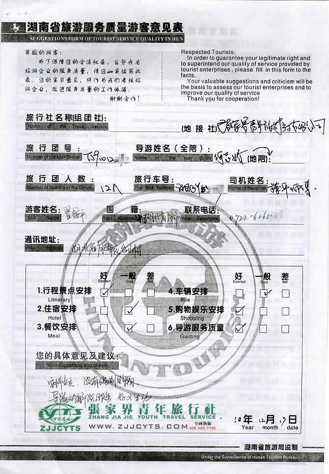 湖北廣水市“瞿先生”與張家界青旅旅游顧問——宋嘉在2010年12月10日取得聯(lián)系,經(jīng)過2次的商談,雙方達成協(xié)議并簽訂了《國內(nèi)旅游組團標(biāo)準(zhǔn)合同》,瞿先生12人一行于12月13日凌晨1點抵達張家界,之后便開始了4天行程的探密湘西之旅。 此次行程是由我們優(yōu)秀導(dǎo)游——何志嬌,負(fù)責(zé)旅游接待工作,何導(dǎo)在旅游過程中講解詳細(xì),服務(wù)周到,客人非常滿意。丙給予導(dǎo)游服務(wù)做出了好評!