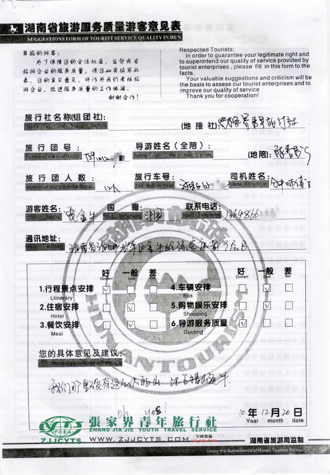 | 再次感謝賈先生一行12人選擇張家界青年旅行社,以及您對(duì)張家界青旅的信任與支持。我們會(huì)繼續(xù)努力,做好旅游接待工作。期待再次得到您的關(guān)注,祝您全家幸福!--劉文英留言