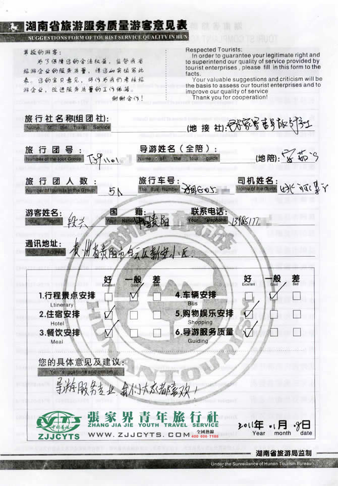 貴州貴陽市“段先生”與張家界青旅旅游顧問——陳苑梅在2010年12月08日取得聯(lián)系,經(jīng)過幾次的商談,雙方達(dá)成協(xié)議并簽訂了《國內(nèi)旅游組團(tuán)標(biāo)準(zhǔn)合同》,于01月02日下午3點(diǎn)抵達(dá)張家界,之后便開始了湘西之旅。 此次行程是由我們優(yōu)秀導(dǎo)游——安茹,負(fù)責(zé)旅游接待工作,安導(dǎo)在旅游過程中講解詳細(xì),服務(wù)周到,客人也很滿意。并給予導(dǎo)游服務(wù)較高的評價(jià)。