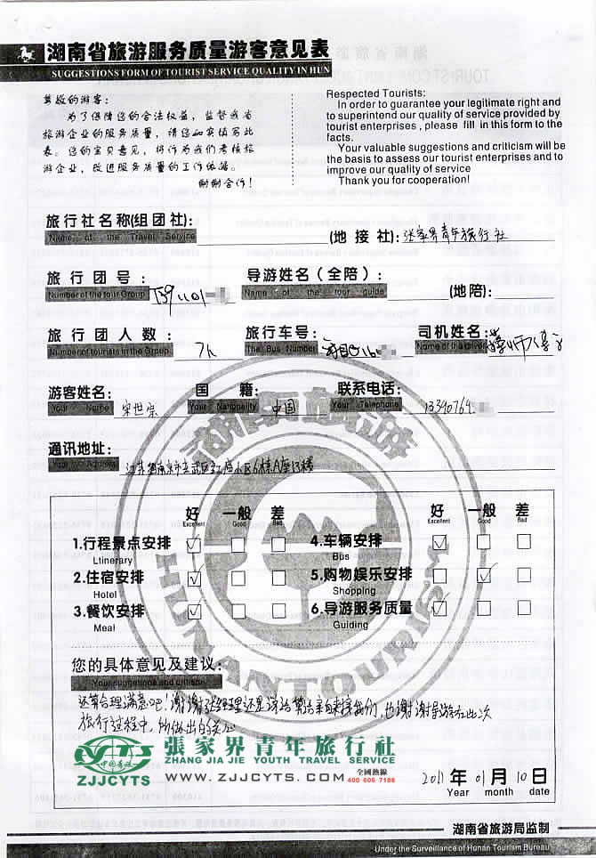 | 再次宋先生一行7人,選擇張家界青年旅行社,以及您對(duì)張家界青旅的信任與支持。我們會(huì)繼續(xù)努力,做好旅游接待工作。期待下一次與您的合作,祝您愉快!--劉文英留言 |