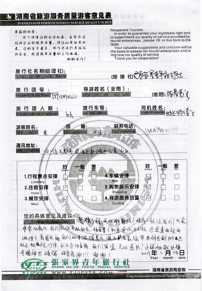 | 四川省成都市“藍(lán)先生”與張家界青旅旅游顧問(wèn)——卓東來(lái)在01月05日取得聯(lián)系,經(jīng)過(guò)幾次的商談,雙方達(dá)成協(xié)議并簽訂了《國(guó)內(nèi)旅游組團(tuán)標(biāo)準(zhǔn)合同》,藍(lán)先生一行6人于01月10日晚抵達(dá)張家界,之后便開(kāi)始了湘西之旅。