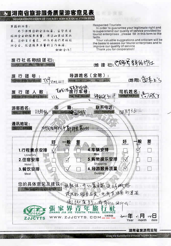湖南省邵陽市“汪先生”與張家界青旅旅游顧問——曹娟在01月03日取得聯(lián)系,經(jīng)過2次的商談,雙方達成協(xié)議并簽訂了《國內(nèi)旅游組團標(biāo)準(zhǔn)合同》,于01月11日中午抵達張家界,之后便開始了湘西之旅。 此次行程是由我們優(yōu)秀導(dǎo)游——孟素素,負(fù)責(zé)旅游接待工作,孟導(dǎo)在旅游過程中講解詳細(xì),服務(wù)周到,客人很滿意!