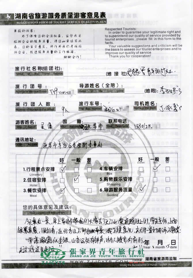 北京豐臺(tái)區(qū)“吳先生”與張家界青旅旅游顧問——曹娟在01月02取得聯(lián)系,經(jīng)過3次的商談,雙方達(dá)成協(xié)議并簽訂了《國內(nèi)旅游組團(tuán)標(biāo)準(zhǔn)合同》,一行9人于01月10日中午抵達(dá)張家界,之后便開始了湘西之旅。 此次行程是由我們優(yōu)秀導(dǎo)游——李世妹,負(fù)責(zé)旅游接待工作,李導(dǎo)在旅游過程中講解詳細(xì),服務(wù)周到,客人也很滿意。!