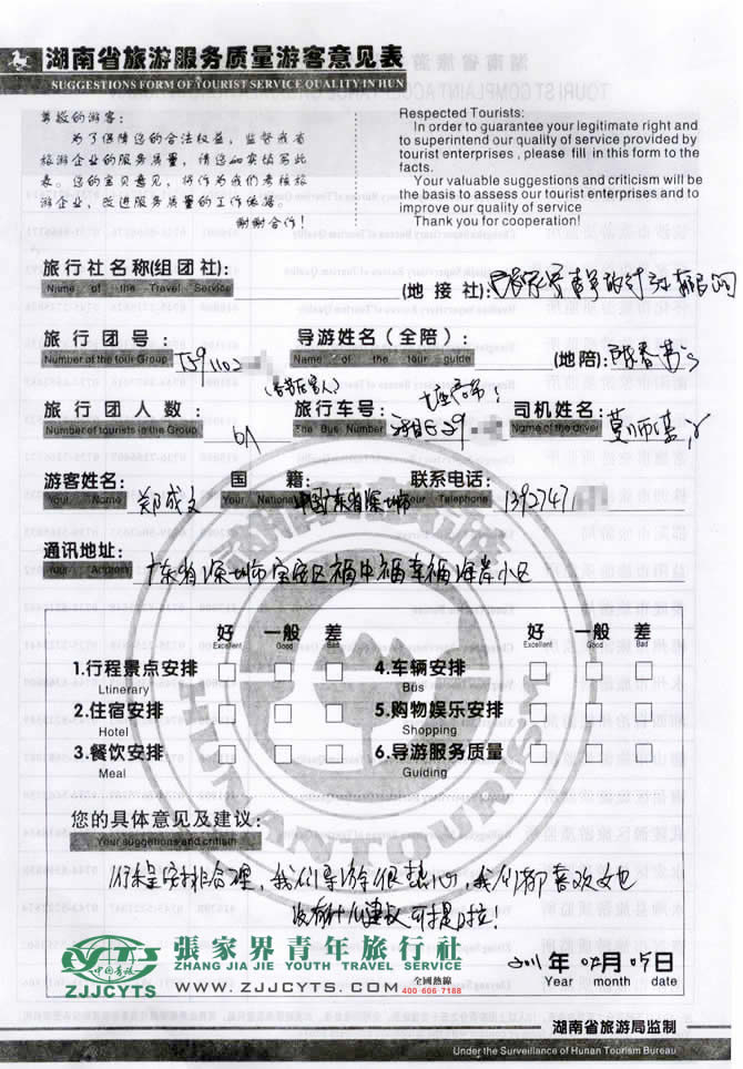 廣東深圳市“鄭先生”與張家界青旅旅游顧問——楊春蘭在01月10日取得聯(lián)系,經(jīng)過3次的商談,雙方達成協(xié)議并簽訂了《國內(nèi)旅游組團標準合同》,鄭先生一行6人自駕車于1月29日下午抵達張家界,之后便開始了過年度假之旅。 此次行程是由我們優(yōu)秀導(dǎo)游——陳春芳,負責旅游接待工作,陳導(dǎo)在旅游過程中講解詳細,服務(wù)周到,客人也很滿意。并給予導(dǎo)游服務(wù)“我們的導(dǎo)游很熱心”評價!