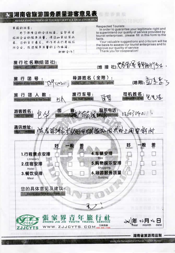 廣東深圳市“包先生”與張家界青旅旅游顧問(wèn)——?jiǎng)⑽挠⒃?1月10日取得聯(lián)系,經(jīng)過(guò)3次的商談,雙方達(dá)成協(xié)議并簽訂了《國(guó)內(nèi)旅游組團(tuán)標(biāo)準(zhǔn)合同》,包先生5人一行自駕車(chē)在01月31日晚抵達(dá)張家界,之后便開(kāi)始了在張家界過(guò)年度假之旅。 此次行程是由我們優(yōu)秀導(dǎo)游——孟素素,負(fù)責(zé)旅游接待工作,孟導(dǎo)在旅游過(guò)程中講解詳細(xì),服務(wù)周到,客人非常滿(mǎn)意。并給予導(dǎo)游服務(wù)好評(píng)!
