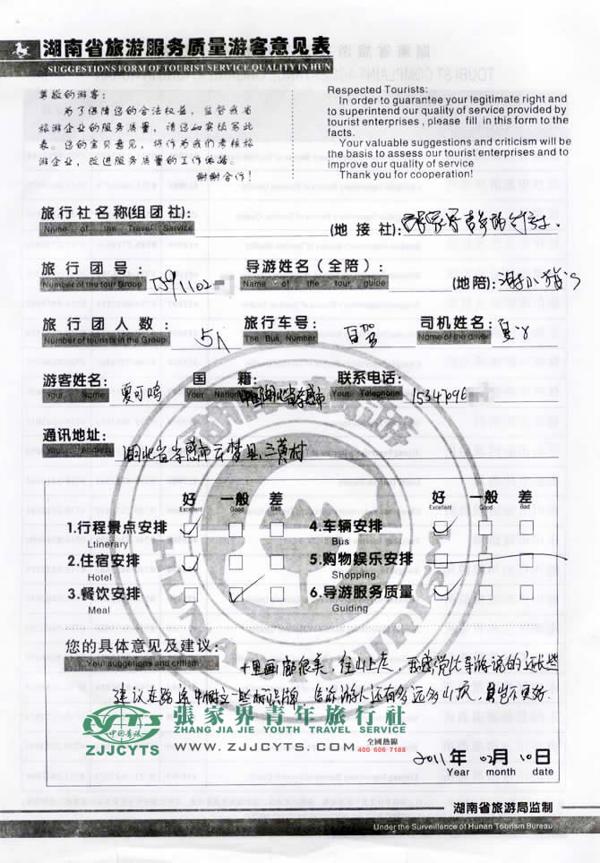 湖北孝感市“夏先生”與張家界青旅旅游顧問——李芳瓊在01月22日取得聯(lián)系,經(jīng)過2次的商談,雙方達成協(xié)議并簽訂了《國內(nèi)旅游組團標準合同》,于春節(jié)后02月05日下午抵達張家界,次日便開始了在張家界新春度假之旅。 此次行程是由我們優(yōu)秀導(dǎo)游——謝小梅,負責(zé)旅游接待工作,謝導(dǎo)在旅游過程中講解詳細,服務(wù)周到,客人也很滿意。并給予導(dǎo)游服務(wù)“”評價!