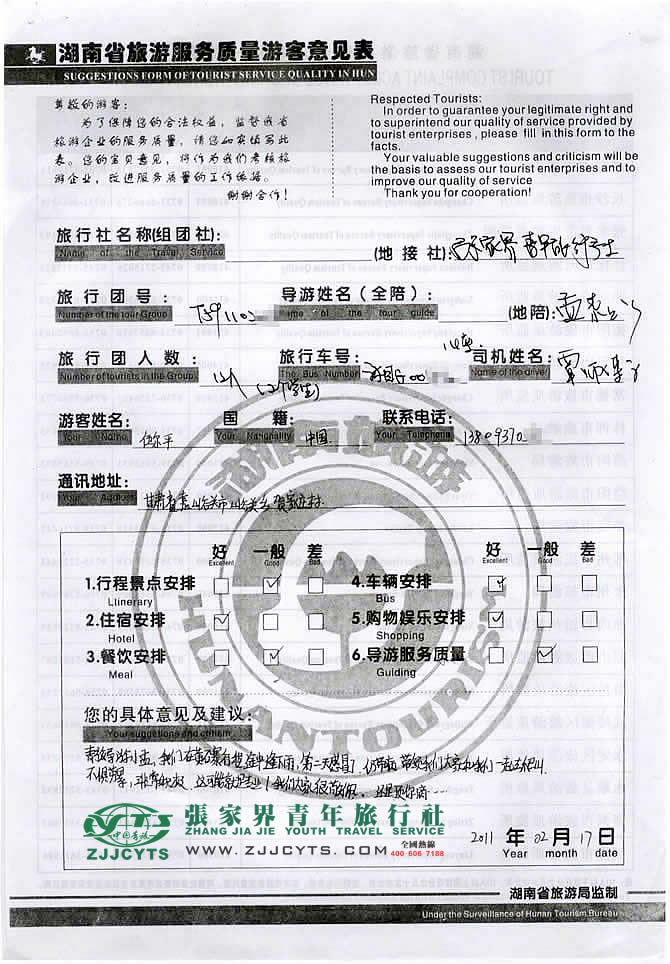 甘肅嘉峪關(guān)市“伍先生”與張家界青旅旅游顧問——胡曉蘭在02月08日取得聯(lián)系,經(jīng)過2次的商談,雙方達成協(xié)議并簽訂了《國內(nèi)旅游組團標(biāo)準(zhǔn)合同》,于02月13日下午抵達張家界,次日便開始了張家界之旅。 此次行程是由我們優(yōu)秀導(dǎo)游——孟素素,負(fù)責(zé)旅游接待工作,孟導(dǎo)在旅游過程中講解詳細(xì),服務(wù)周到,客人也很滿意。并給予導(dǎo)游服務(wù)“非常積極,大家很敬佩”的評價!