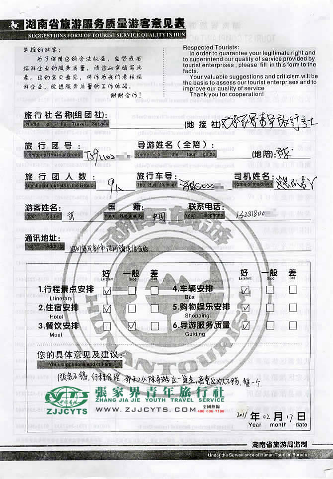 四川成都市“武女士”與張家界青旅旅游顧問——陳苑梅在2月11日取得聯(lián)系,經(jīng)過2次的商談,確認(rèn)后雙方達(dá)成協(xié)議并簽訂了《國內(nèi)旅游組團(tuán)標(biāo)準(zhǔn)合同》,于02月14日晚抵達(dá)張家界,次日便開始了張家界之旅。 此次行程是由我們優(yōu)秀導(dǎo)游——陳科銘,負(fù)責(zé)旅游接待工作,陳導(dǎo)在旅游過程中講解詳細(xì),服務(wù)周到,客人也很滿意。并給予導(dǎo)游服務(wù)較高的評價!