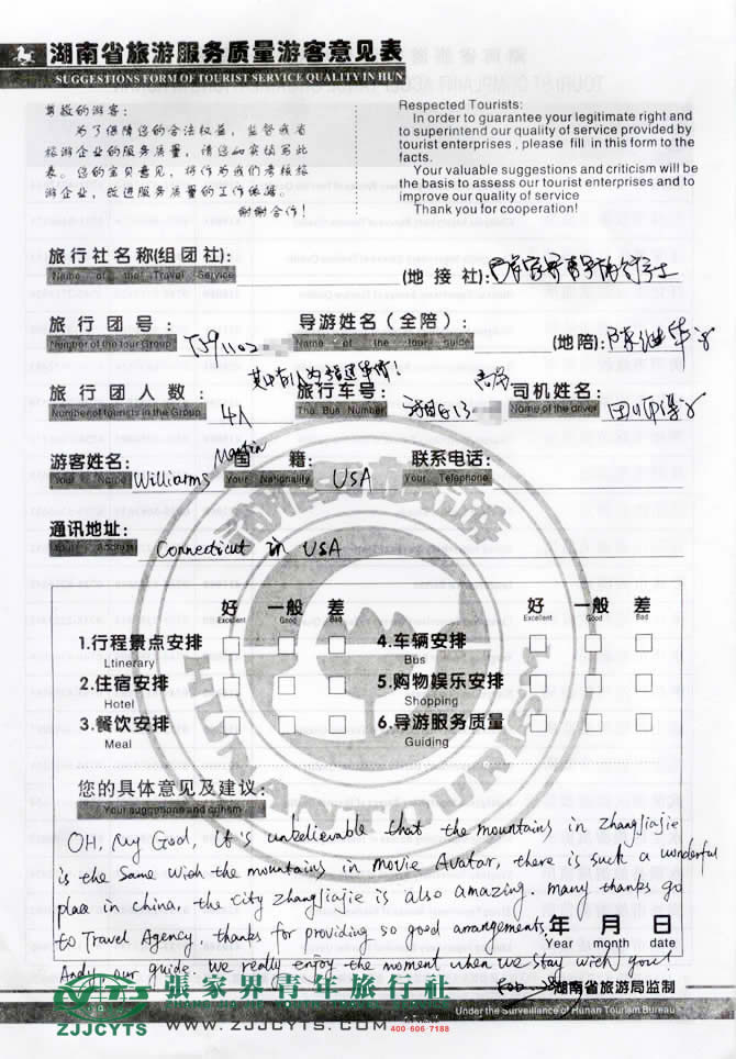 | 再次感謝Williarms Martin先生選擇張家界青年旅行社,以及您對(duì)張家界青旅的信任與支持。祝愿您歸國(guó)順利。把中國(guó)人民的友好,傳遞給您的家人和朋友,謝謝!--胡曉蘭留言