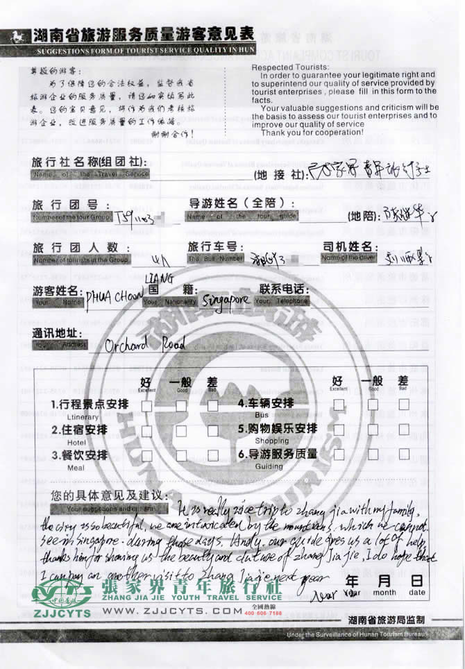 “It is really nice trip to zhangjiajie with my family, the city is so beautiful, we are intoxicated by the mountians, which we can not see in Singapore. during those days, Andy, our guide, gives us a lot of help, thanks him for showing us the beauty and cluture of ZhangJiajie, I do hope that I can pay an another visit to ZhangJiajie next year. ”