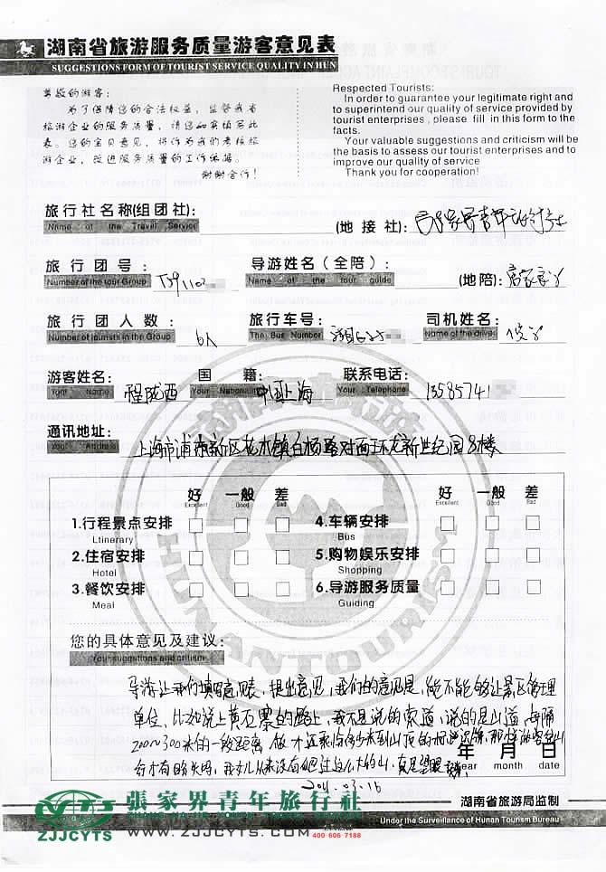程先生: 您好!我是公司負(fù)責(zé)人張德建,衷心的感謝您選擇我們青旅給您服務(wù),同時(shí)也感謝您提出的的寶貴建議,我一定會把你的建議電告景區(qū)管理部門,歡迎您和你的朋友,再來蒞臨張家界!祝愿您全家安康幸福! --張德建(副總經(jīng)理)恭上。