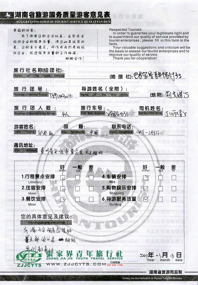 貴州安順市“鄔女士”與張家界青旅旅游顧問——楊春蘭在3月15日晚取得聯(lián)系,經(jīng)過一次的商談,雙方達成協(xié)議并簽訂了《國內旅游組團標準合同》,于3月16日上午自鳳凰乘火車抵達張家界,次日便開始了張家界之旅。 此次行程是由我們優(yōu)秀導游——劉文娟,負責旅游接待工作,劉導在旅游過程中講解詳細,服務周到,客人也很滿意。并給予導游服務“服務態(tài)度好,景點解說認真細致”的高評價!