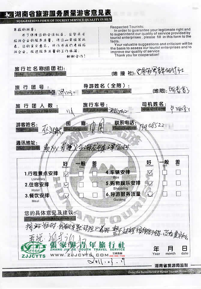 貴州遵義市“巫先生”與張家界青旅旅游顧問——蔣麗嬌在3月13日取得聯(lián)系,經(jīng)過(guò)2次的商談,雙方達(dá)成協(xié)議并簽訂了《國(guó)內(nèi)旅游組團(tuán)標(biāo)準(zhǔn)合同》,于3月16日下午抵達(dá)張家界,之后便開始了愉快的張家界之旅。 此次行程是由我們優(yōu)秀導(dǎo)游——陳春芳,負(fù)責(zé)旅游接待工作,陳導(dǎo)在旅游過(guò)程中講解詳細(xì),服務(wù)周到,客人也很滿意。并給予導(dǎo)游服務(wù)“整個(gè)接待過(guò)程很不錯(cuò)”好評(píng)!