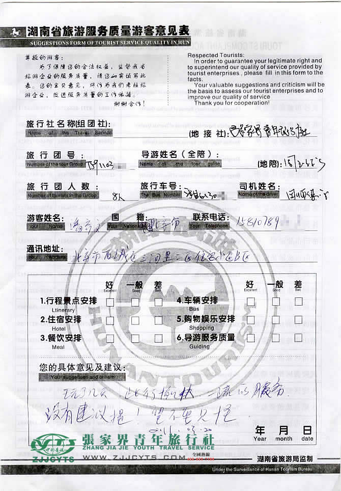 北京西城區(qū)“潘先生”與張家界青旅旅游顧問——李芳瓊在3月10日取得聯(lián)系,經(jīng)過2次的商談,雙方達(dá)成協(xié)議并簽訂了《國內(nèi)旅游組團(tuán)標(biāo)準(zhǔn)合同》,于3月16日晚上抵達(dá)張家界,便開始了愉快的湘西之旅。 此次行程是由我們優(yōu)秀導(dǎo)游——周玉紅,負(fù)責(zé)旅游接待工作,周玉紅導(dǎo)游在旅游過程中,服務(wù)周到,景點(diǎn)講解詳細(xì),客人也非常滿意。并給予了“一流服務(wù)”的好評!