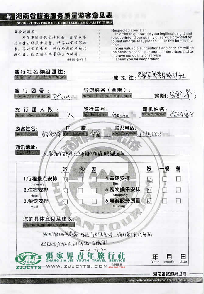 江蘇南京市“駱先生”與張家界青旅旅游顧問(wèn)——宋嘉在3月9取得聯(lián)系,經(jīng)過(guò)2次商談,雙方達(dá)成協(xié)議并簽訂了《國(guó)內(nèi)旅游組團(tuán)標(biāo)準(zhǔn)合同》,于3月16午抵達(dá)張家界,之后便開(kāi)始了湘西之旅。 此次行程是由我們優(yōu)秀導(dǎo)游——李彩萍,負(fù)責(zé)旅游接待工作,李導(dǎo)在旅游過(guò)程中講解詳細(xì),服務(wù)周到,客人也很滿意。并給予導(dǎo)游服務(wù)評(píng)價(jià):“感謝導(dǎo)游小劉的熱情陪同”!