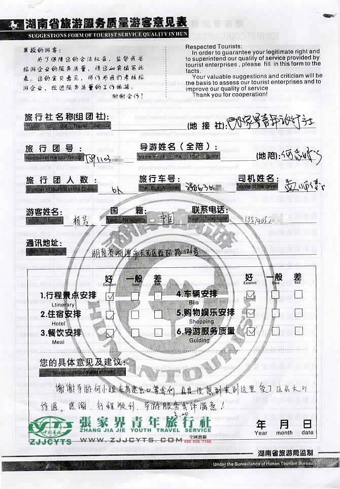 湖南湘潭市“楊女士”與張家界青旅旅游顧問——卓東來在3月14得聯(lián)系,經過一次的商談,雙方達成協(xié)議并簽訂了《國內旅游組團標準合同》,于3月17下午抵達張家界,之后便開始了愉快的湘西之旅。 此次行程是由我們優(yōu)秀導游——何志嬌,負責旅游接待工作,何導在旅游過程中,講解詳細,服務周到,客人也很滿意。并給予導游服務給予“導游服務我評滿意的”評價!