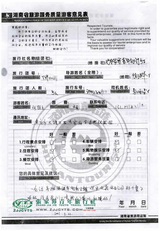 重慶大渡口“何先生”與張家界青旅旅游顧問——張瑜珂在3月10日取得聯(lián)系,經(jīng)過2次的商談,雙方達成協(xié)議并簽訂了《國內(nèi)旅游組團標準合同》,于3月18日晚抵達張家界,之后便開始了愉快的張家界之旅。 此次行程是由我們優(yōu)秀導游——陳繼華,負責旅游接待工作,陳導在旅游過程中,充分發(fā)揮自己的語言能力,講解詳細,服務周到,客人也很滿意。并給予導游服務,給予服務不錯的品質好評!